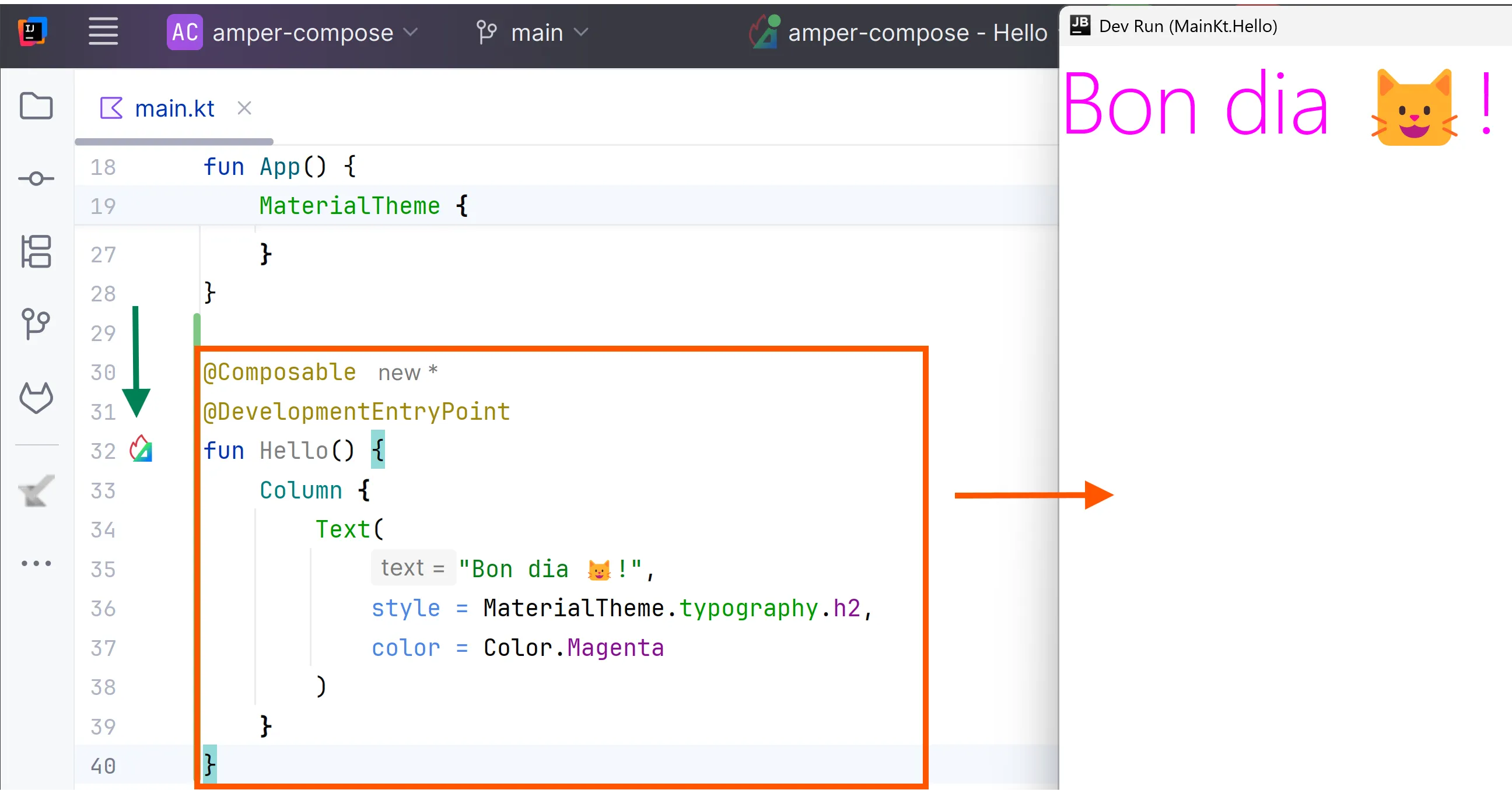 settings: compose: enabled: true experimental: hotReload: enabledQuan executes la teva aplicació amb Compose Hot Reload activat: