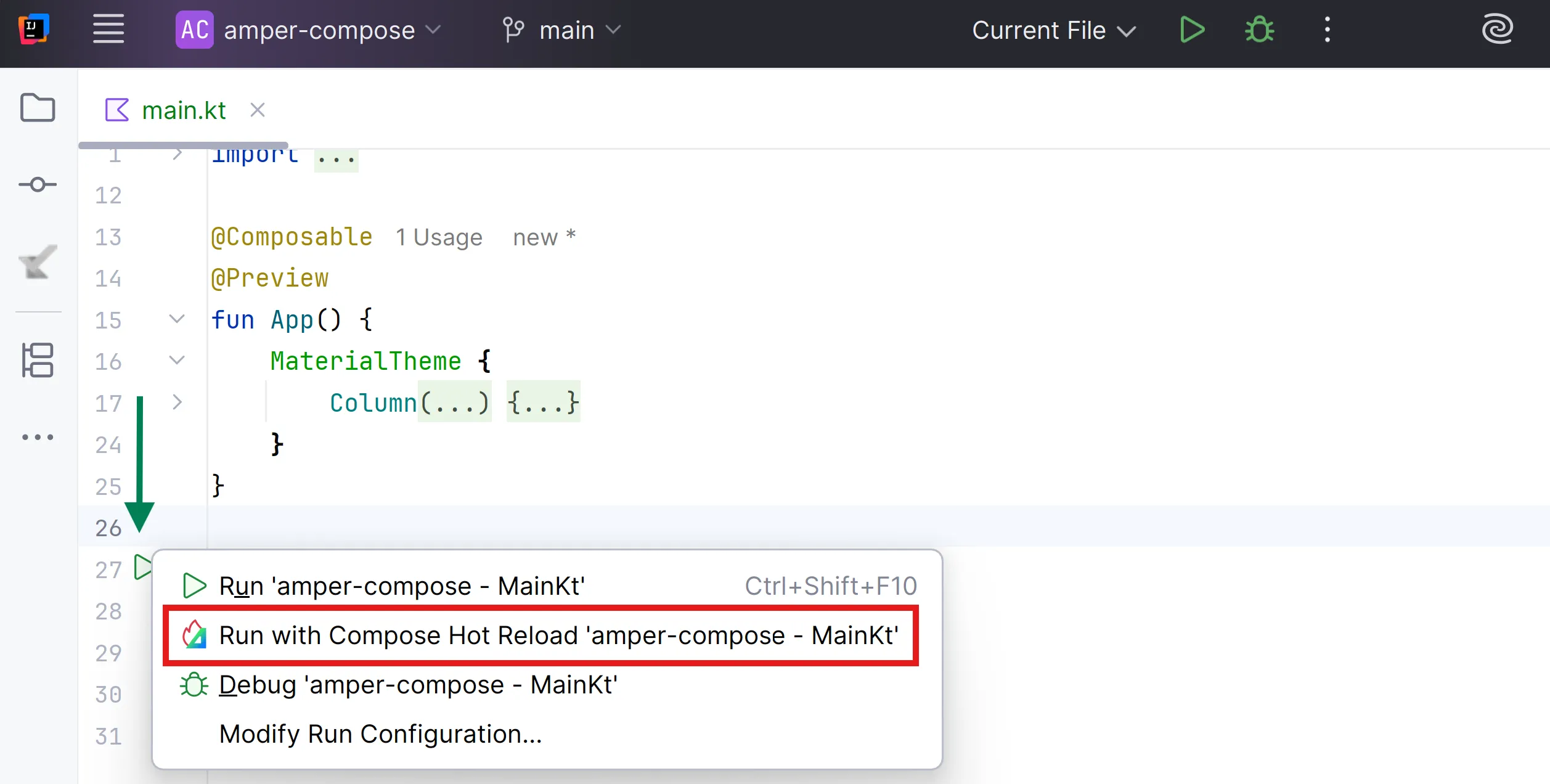 També és possible executar composables específics com a mode Compose Hot Reload.