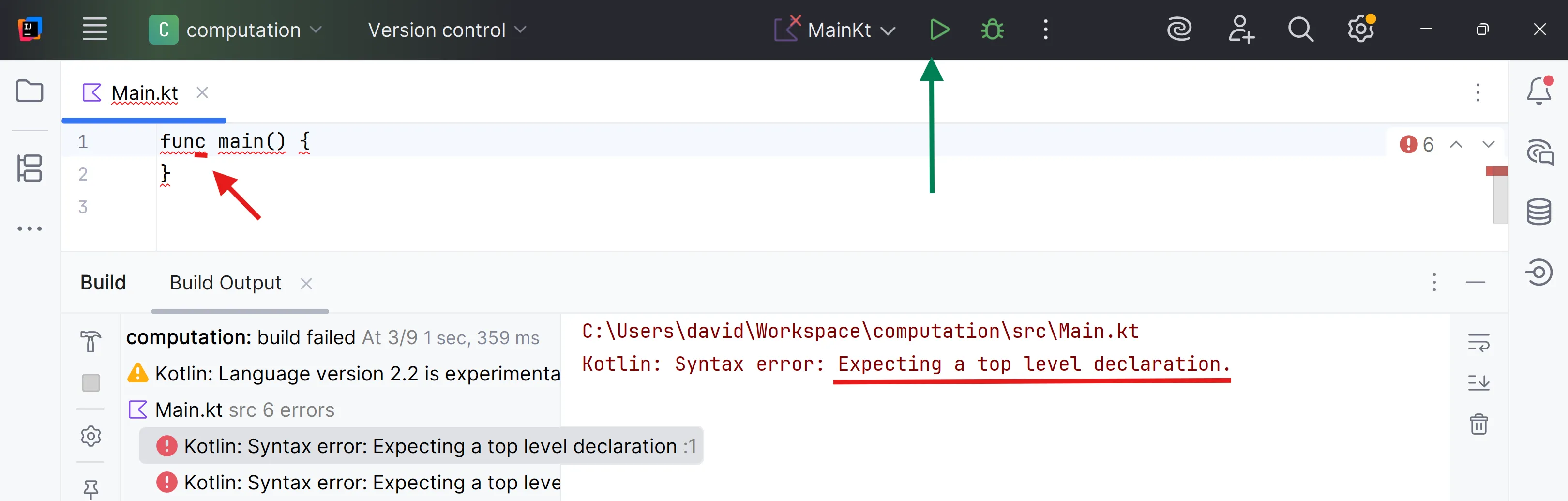 func main() {}Pots veure que la IDE t’indica en vermell que hi ha un error de sintaxi, i si executes el codi passa el que t’havien dit: