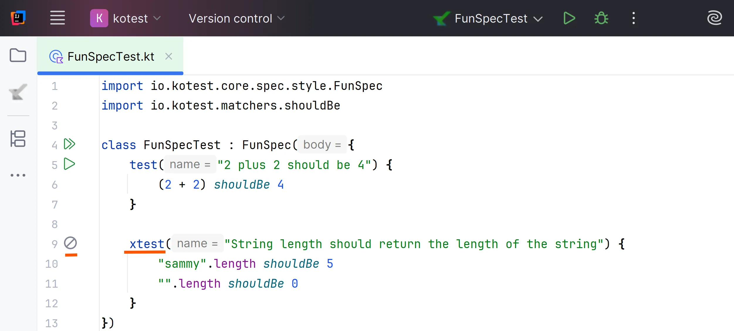 FunSpec et permet crear tests invocant una funció anomenada test amb un argument string per descriure el test, i després el test en si com una lambda.