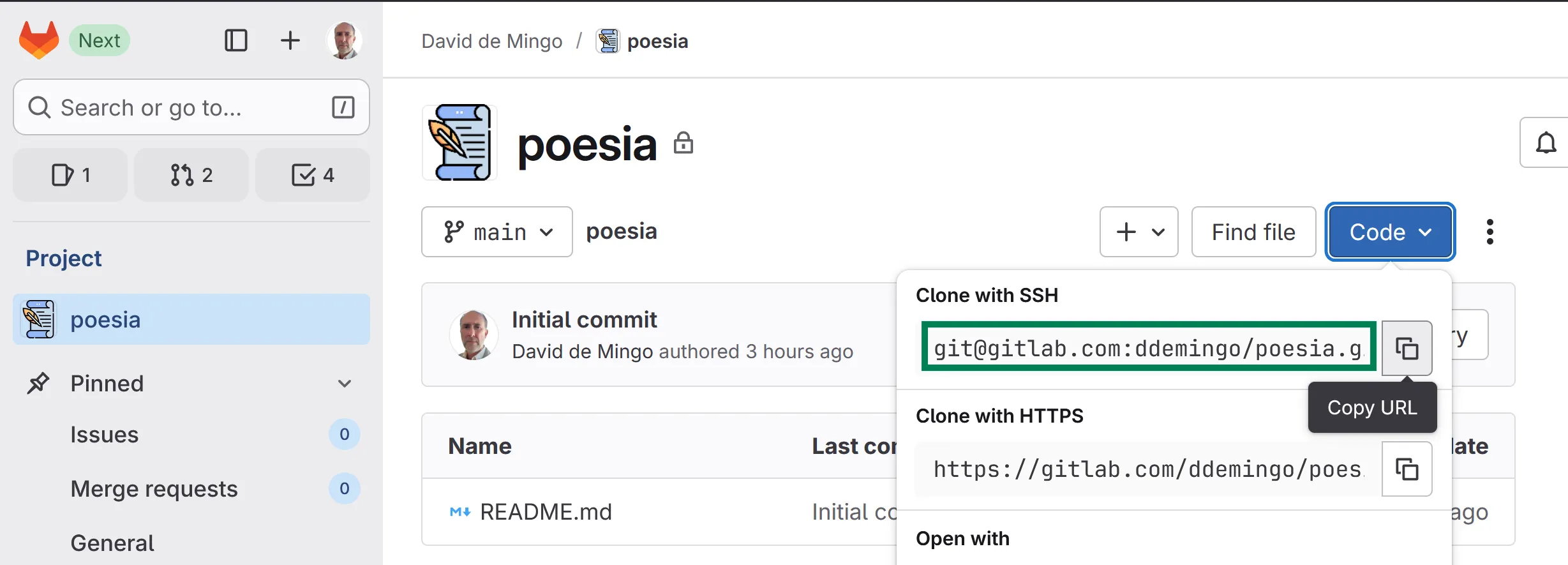 git add .\ara-mateix.txtgit commit -a -m "Afegit primera estrofa del poema 'Ara mateix' de Miquel Martí i Pol"[main ade00cb] Afegit primera estrofa del poema 'Ara mateix' de Miquel Martí i Pol 1 file changed, 5 insertions(+) create mode 100644 ara-mateix.txtEl repositori local està configurat amb el repositori remot de Gitlab: