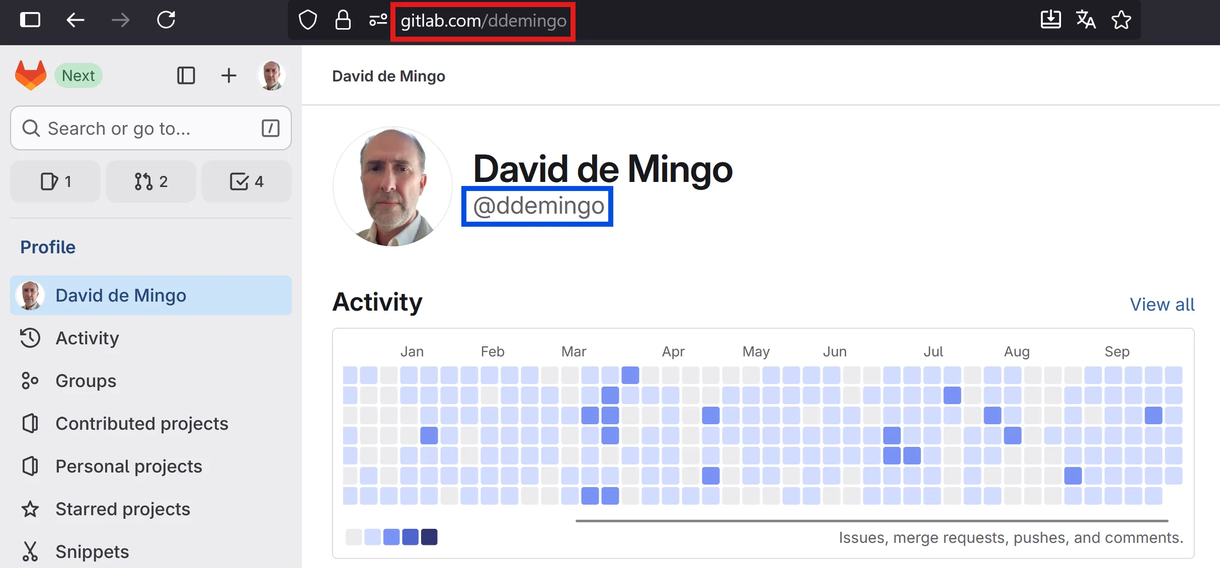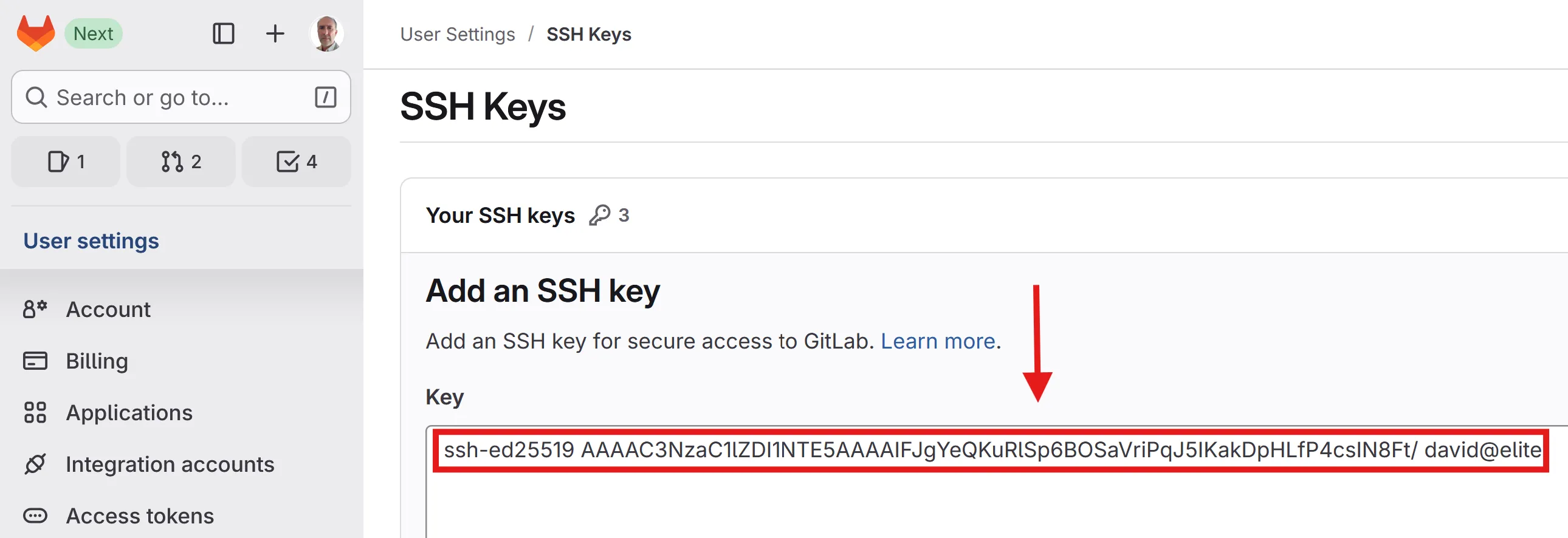 gc .\.ssh\id_ed25519.pubssh-ed25519 AAAAC3NzaC1lZDI1NTE5AAAAIFJgYeQKuRlSp6BOSaVriPqJ5IKakDpHLfP4csIN8Ft/ david@eliteAfegeix la teva clau pública a GitLab: