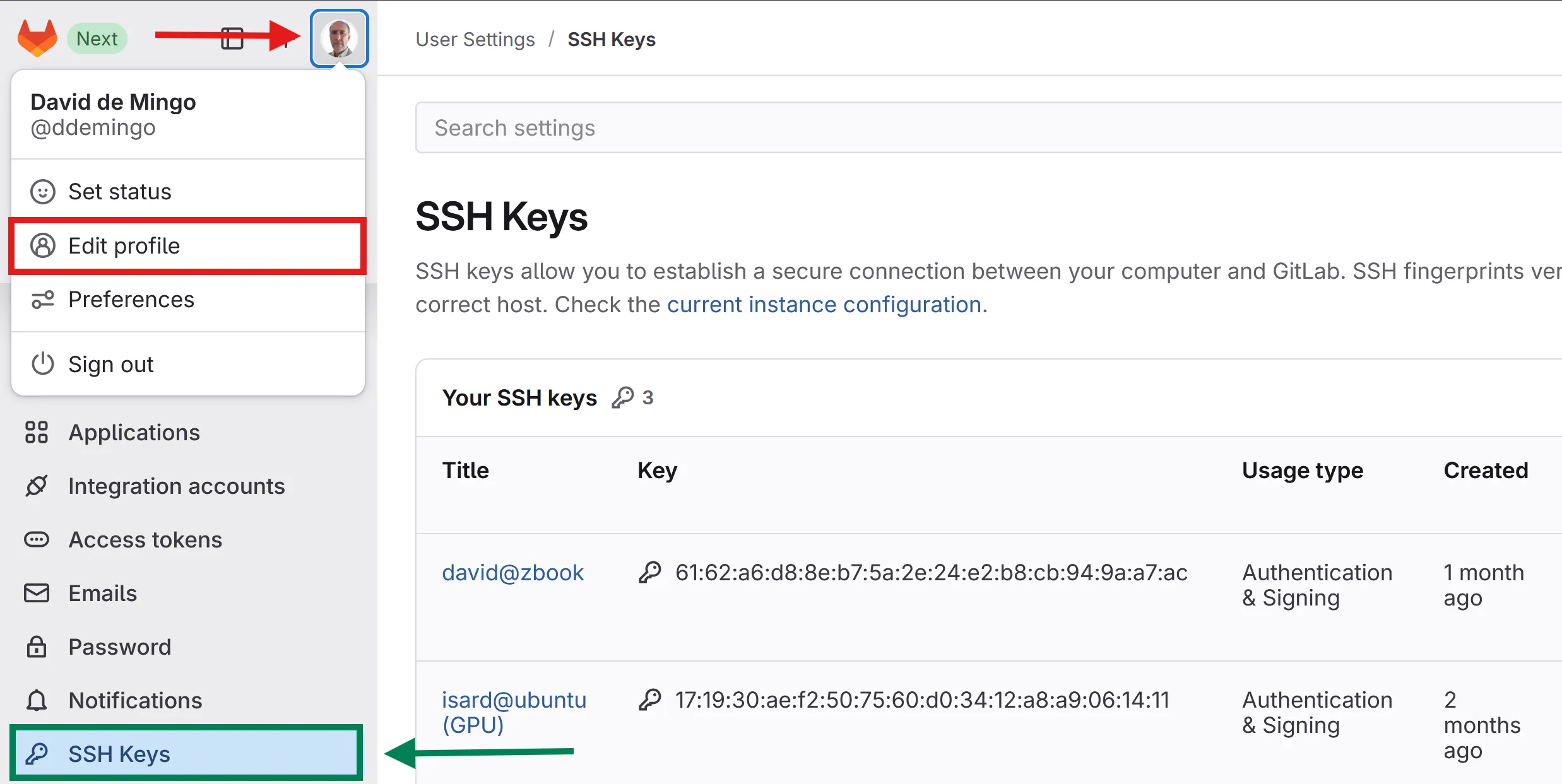 ssh-keygenAfegeix la clau pública a Gitlab.