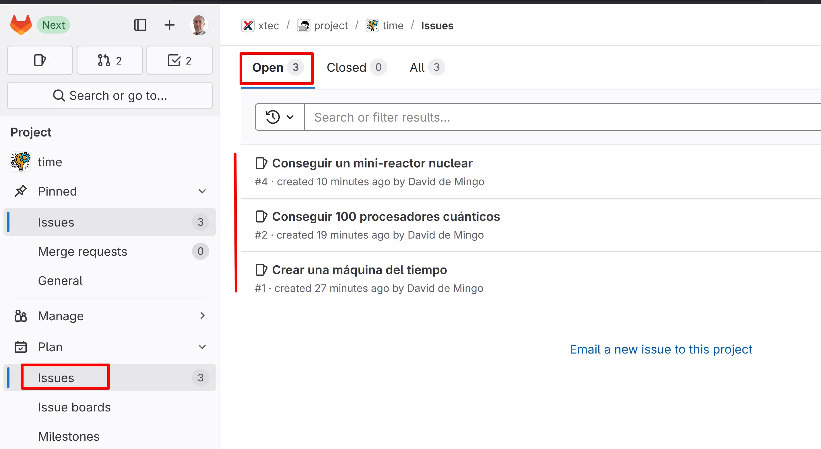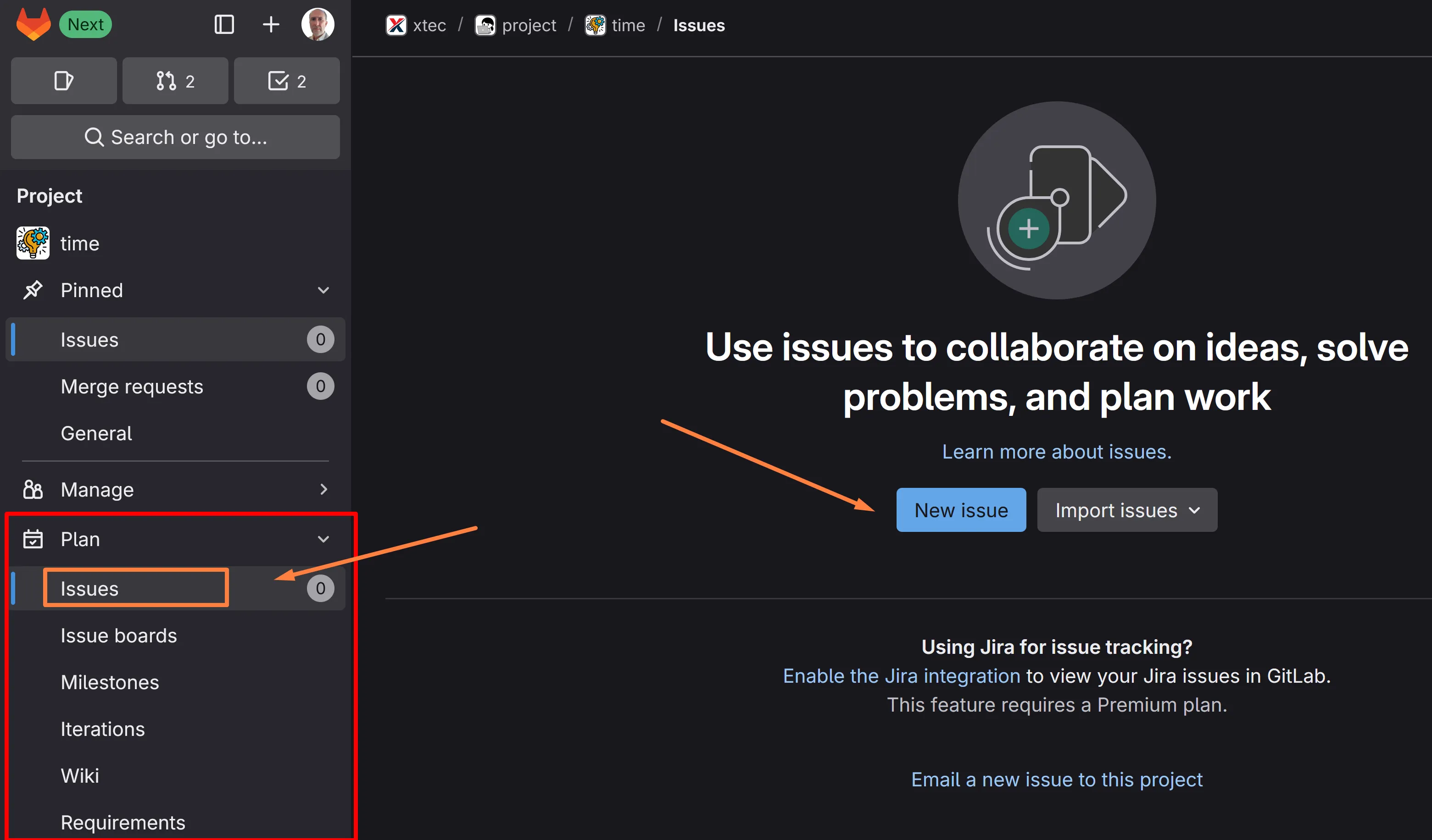 Selecciona l’opció de crear una nova tasca (Issue):