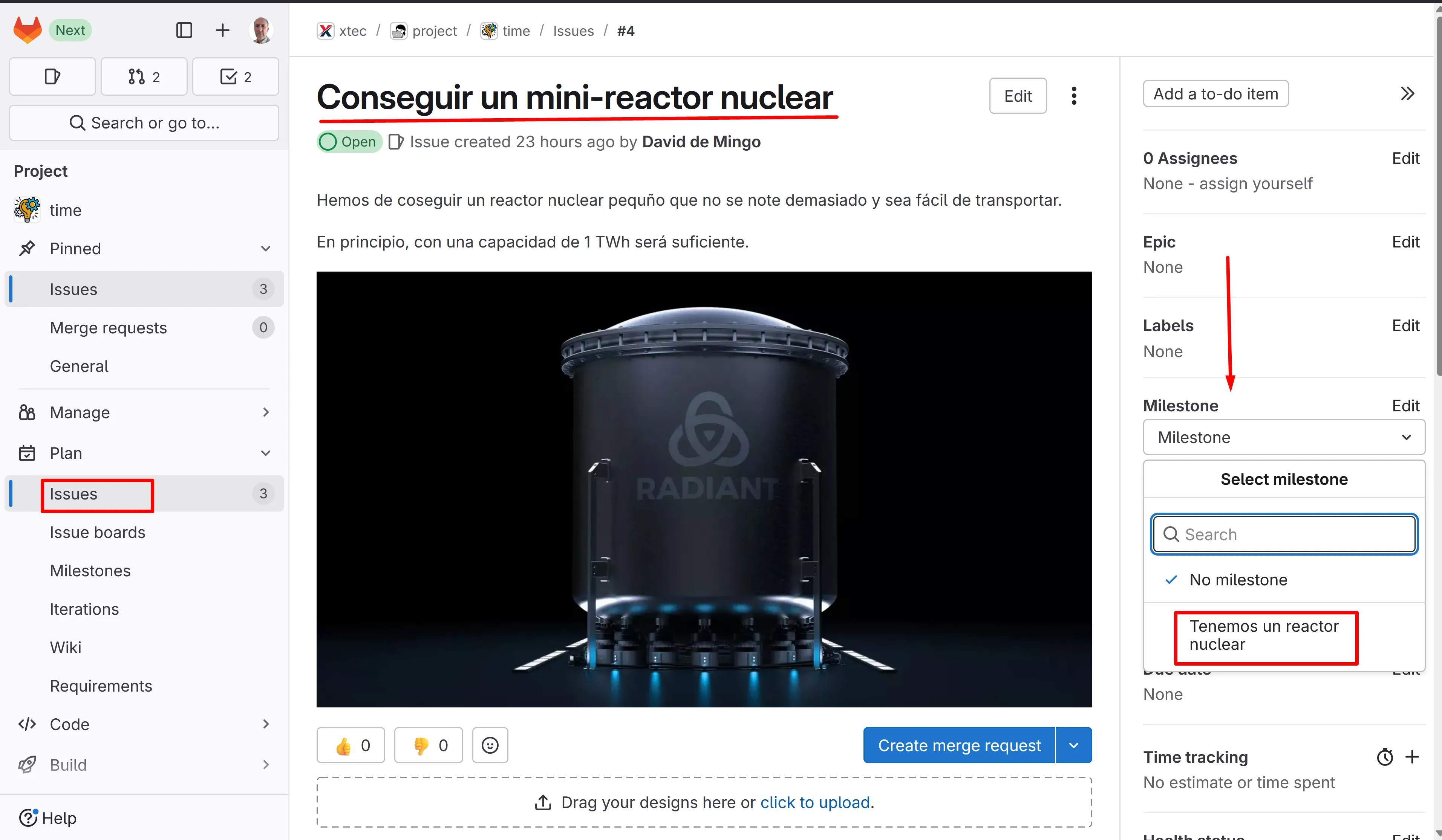 Afegeix la issue “Aconseguir un minireactor nuclear” al milestone: