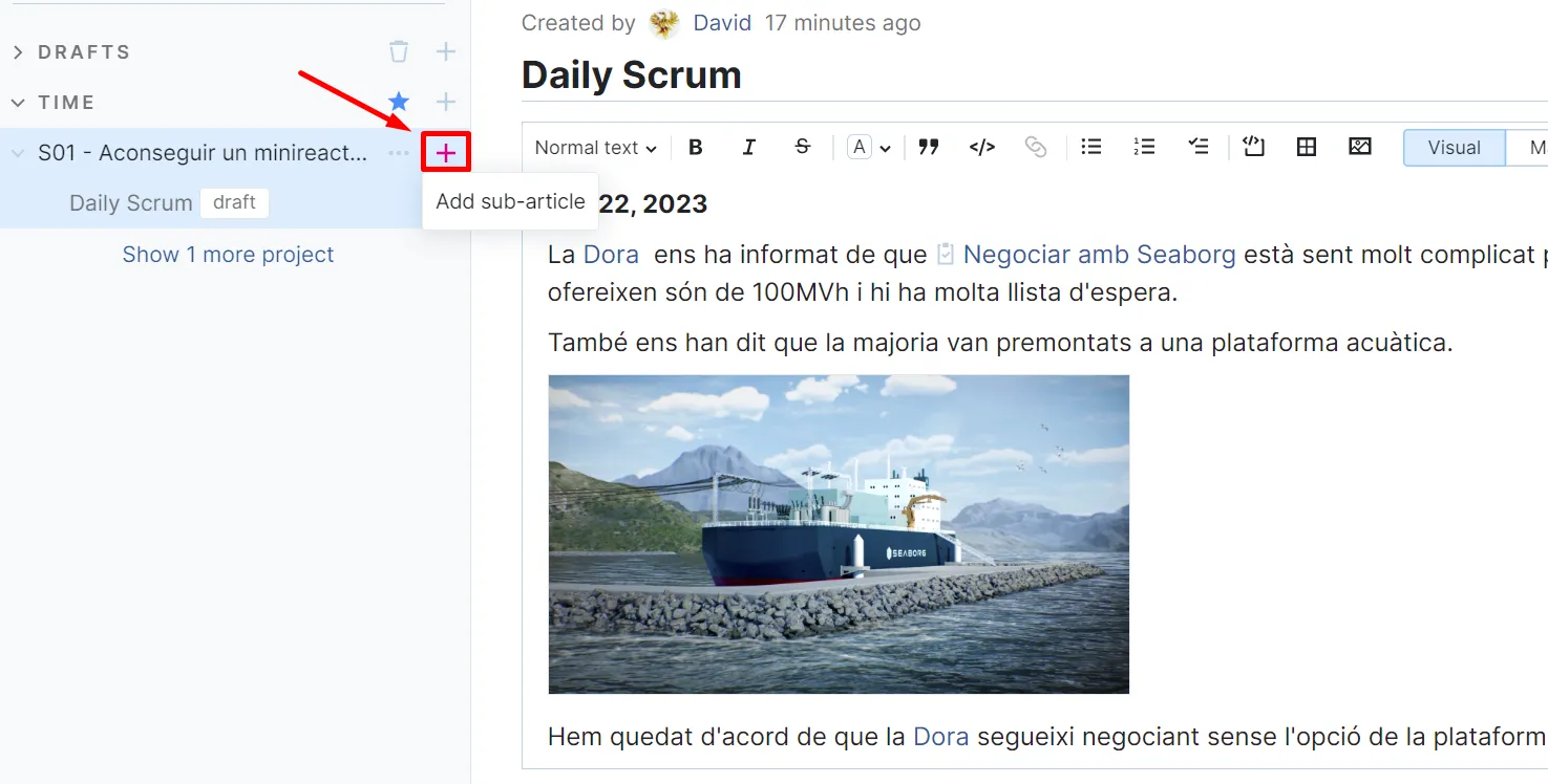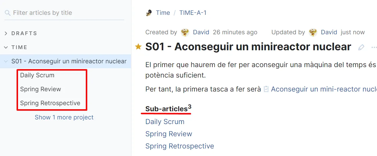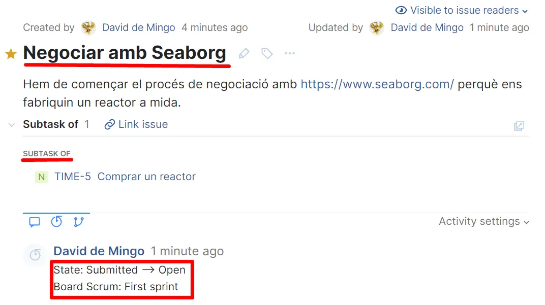 Per exemple, un membre de l’equip pot afegir a la subtasca “Comprar reactor” una subtasca “Negociar amb Seaborg”: