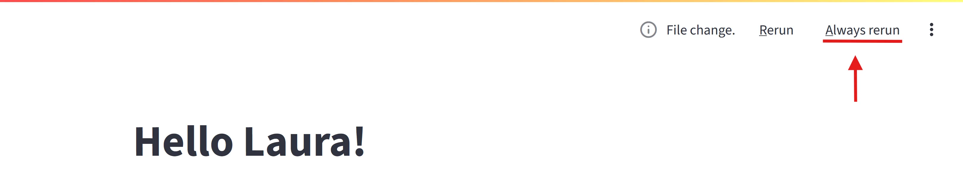 Cada vegada que vulguis actualitzar la teva app, desa el fitxer font. Quan ho facis, Streamlit detecta si hi ha canvis i et pregunta si vols tornar a executar l’app. Tria “Always rerun” a la part superior dreta per actualitzar automàticament la teva app cada vegada que canviïs el codi font.