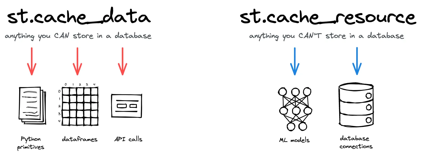 st.cache_resourceés la manera recomanada de posar en memòria cau recursos globals com models de ML o connexions de bases de dades. Utilitzast.cache_resourcequan la teva funció retorni objectes no serialitzables que no vols carregar múltiples vegades. Retorna el mateix objecte en memòria cau, que es comparteix entre totes les reexecucions i sessions sense còpia ni duplicació. Si mutes un objecte que està en memòria cau utilitzantst.cache_resource, aquesta mutació existirà en totes les reexecucions i sessions.