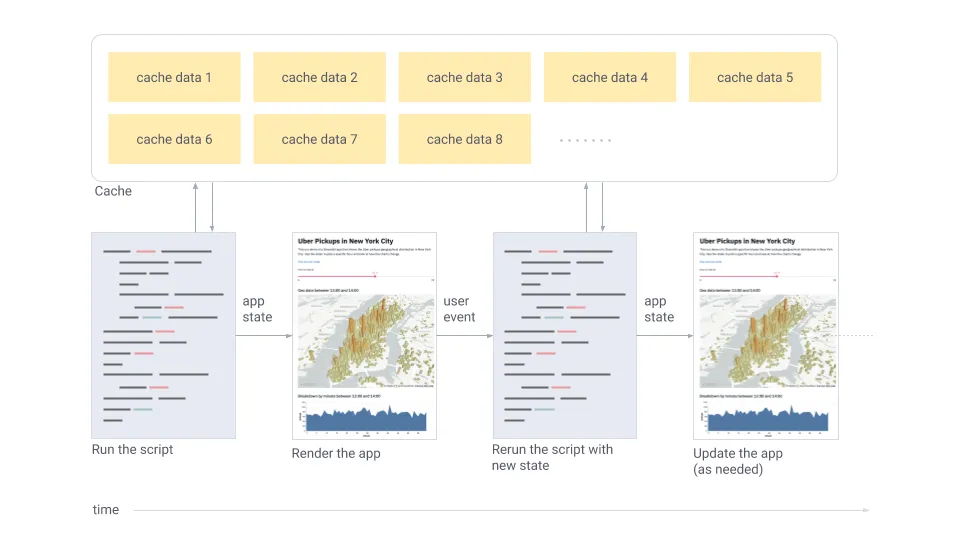 Abans d’executar el codi dins de long_running_function, Streamlit comprova la seva memòria cau per trobar un resultat guardat prèviament. Si troba un resultat en memòria cau per a la funció i els valors d’entrada donats, retornarà aquest resultat en memòria cau i no tornarà a executar el codi de la funció. En cas contrari, Streamlit executa la funció, guarda el resultat a la seva memòria cau i continua amb l’execució de l’script. Durant el desenvolupament, la memòria cau s’actualitza automàticament a mesura que canvia el codi de la funció, assegurant que els últims canvis es reflecteixin a la memòria cau.