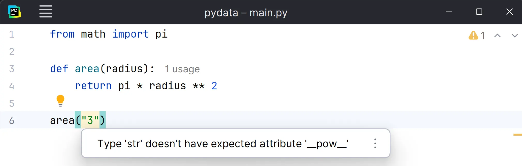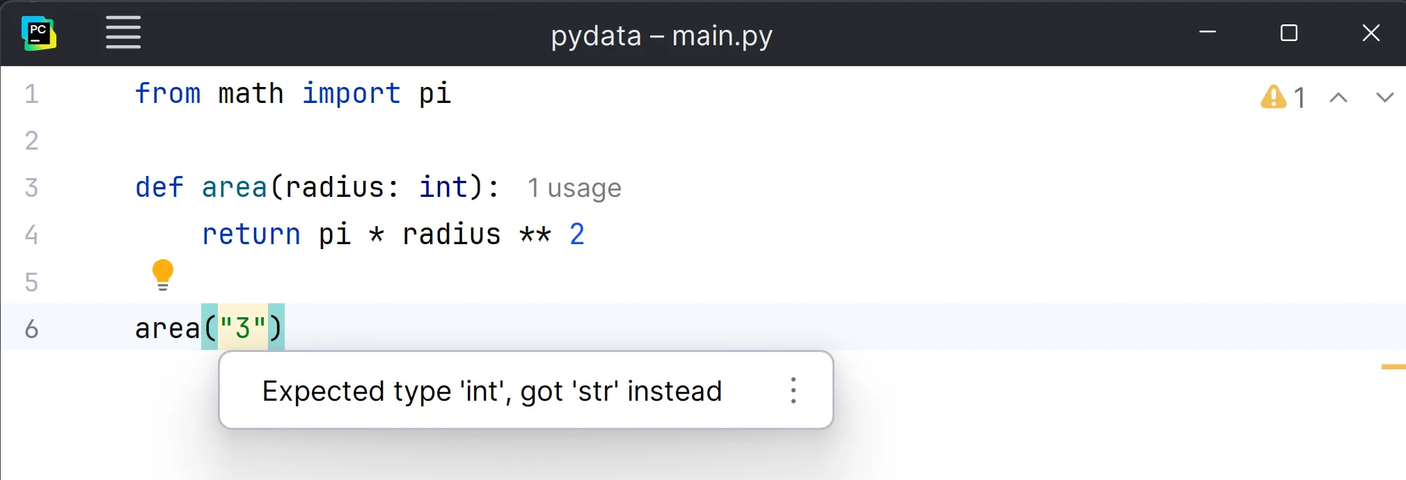 area("3")Com que el paràmetre radius està anotat amb el “tipus” int, l’editor t’avisa que no pots cridar la funció area amb un str: