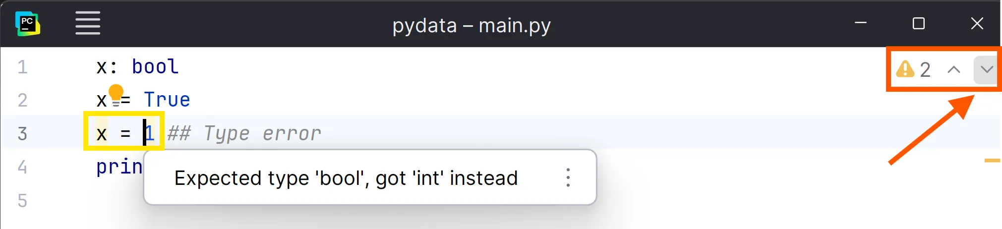 x: boolx = Truex = 1 ## Type errorprint(x)I Pycharm t’indicarà un error si a la variable x li assignes un int: