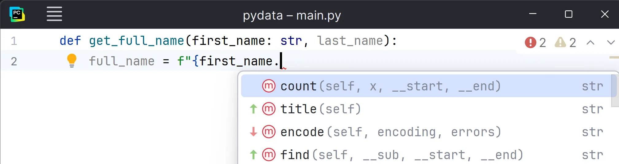 Si demanes a la IDE que t’ajudi amb Ctrl + Space, t’ajuda perquè Pycharm considera que el paràmetre first_name és de tipus str.