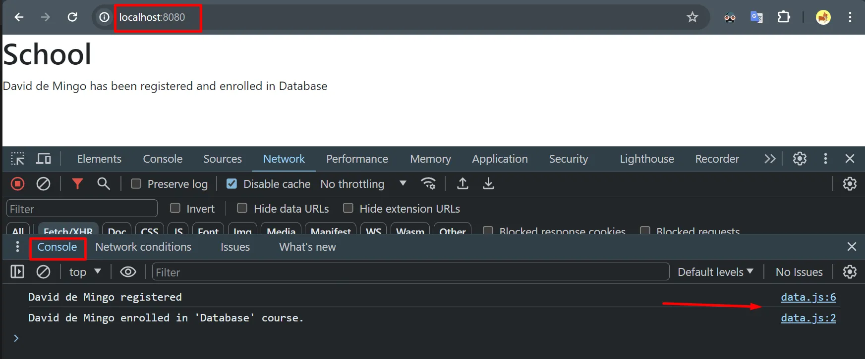 $ node index.jsDavid de Mingo registeredDavid de Mingo enrolled in 'Database' course.Import