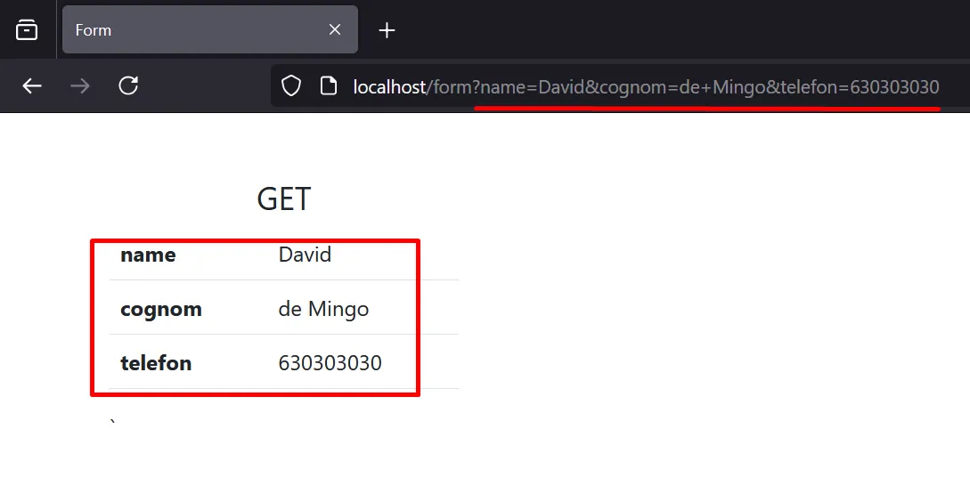Si et fixes en la URL, pots veure les dades del formulari que has omplert: