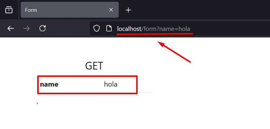 app.get('/form', (req: Request, res: Response) => { res.render("form", { title: "GET", params: req.query })})El servidor crea un document web amb una taula on estan totes les dades que ha rebut, que estan en la propietat req.query, i retona un document HTML: