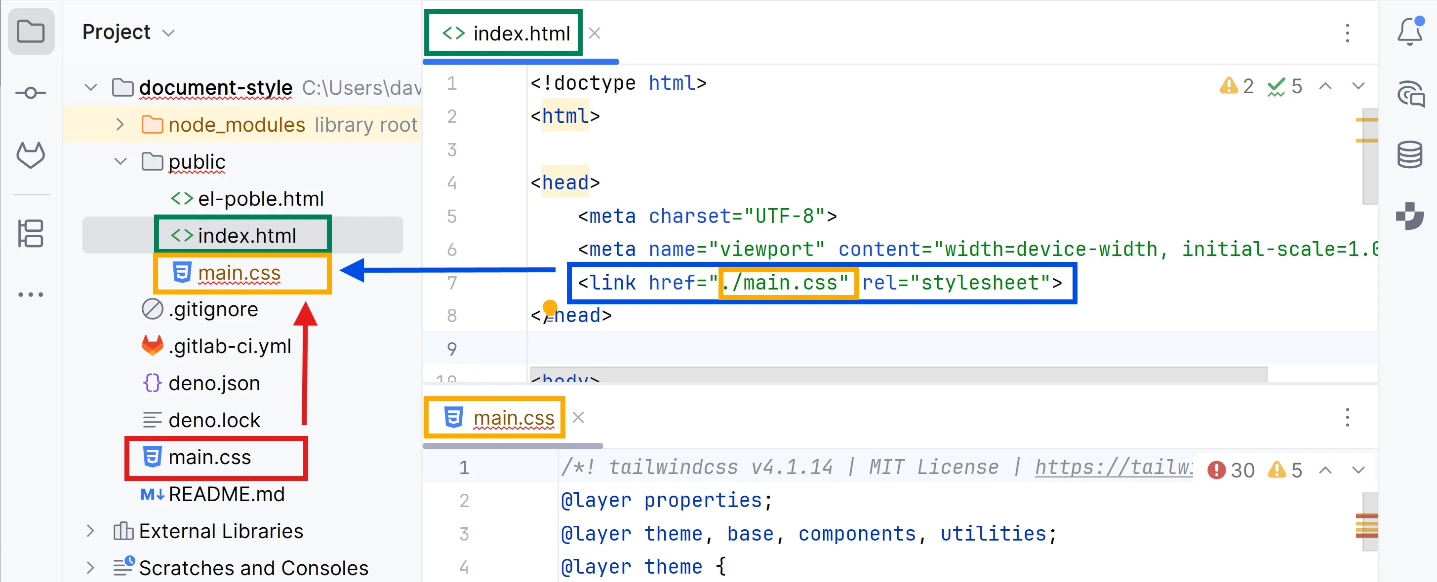 deno run cliL’script arrenca tailwind en mode “watch”, de manera que cada cop que modifiquis el fitxer main.css, tailwind torna a generar el fitxer public/main.css.