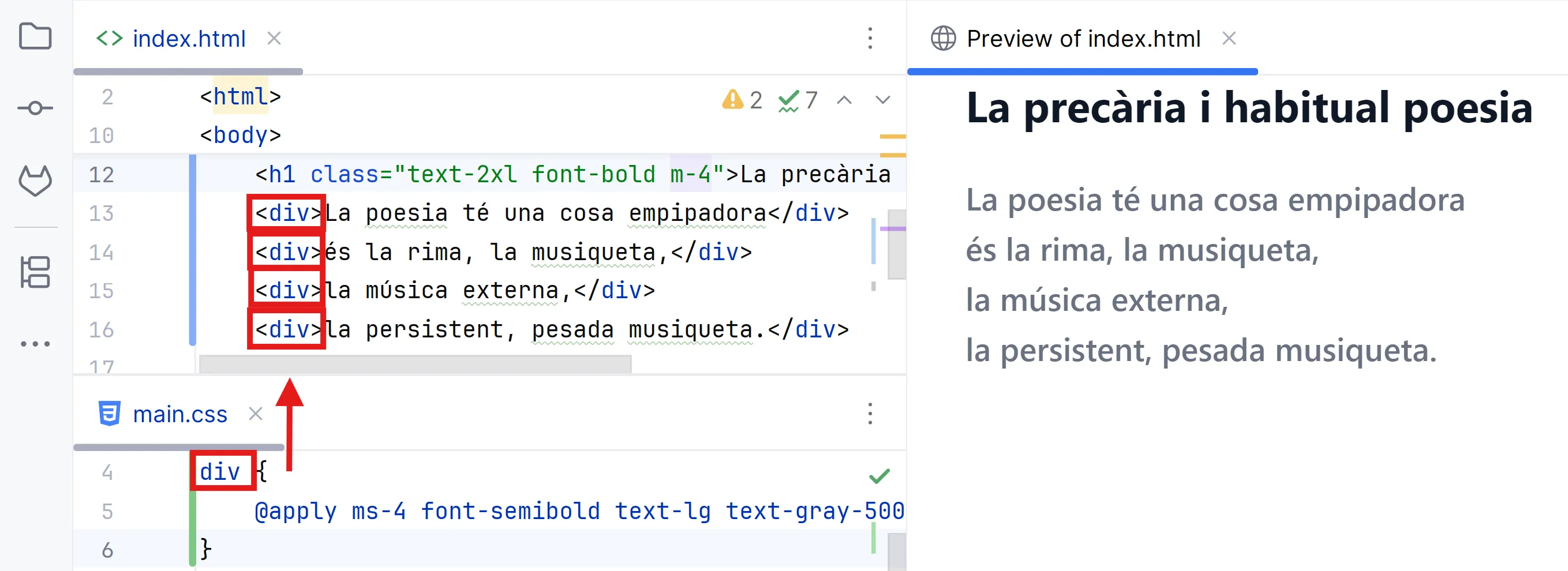 <h1 class="text-2xl font-bold m-4">La precària i habitual poesia</h1> <div>La poesia té una cosa empipadora</div> <div>és la rima, la musiqueta,</div> <div>la música externa,</div> <div>la persistent, pesada musiqueta.</div>Si vols aplicar el mateix estil a tots els elements <div> pots utilitzar una regla CSS.