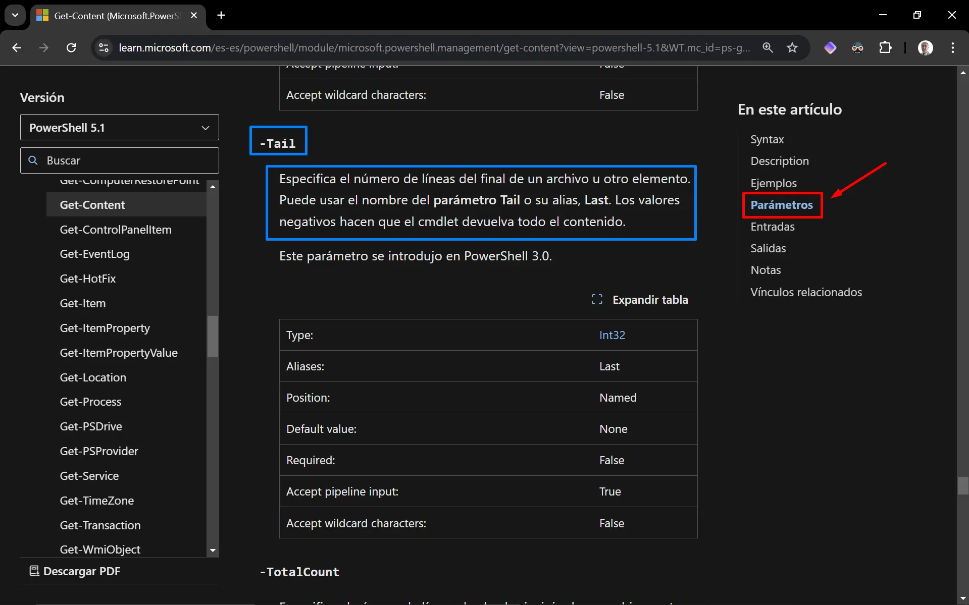 SYNTAX...La teva pàgina pot ser lleugerament diferent, però la part important per mirar en aquest moment és la secció anomenada “SYNTAX”: aquesta mostra tots els paràmetres que podem afegir a Get-Conent.