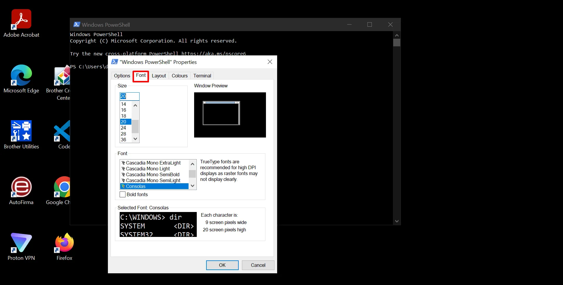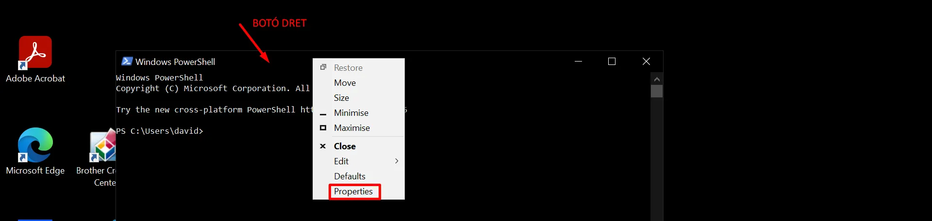 Si vols fer canvis permanents, has de fer clic amb el botó dret del ratolí a la barra de dalt de la finestra de la consola per obrir la finestra propietats: